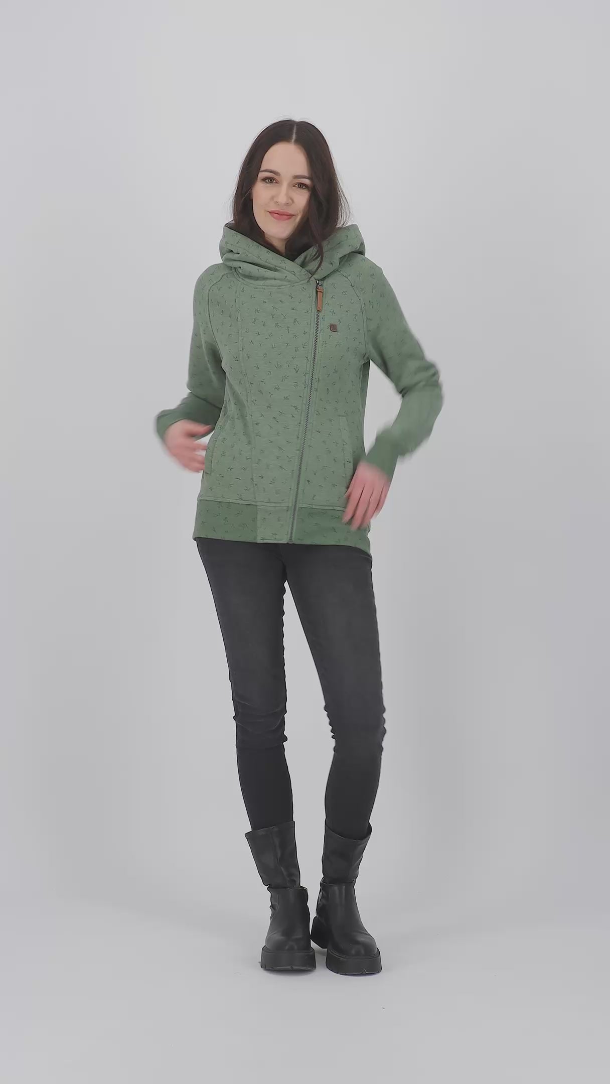 - Große Wickelkapuze, seitliche Eingriffstaschen und formstabile Rippbündchen an Ärmeln und Saum